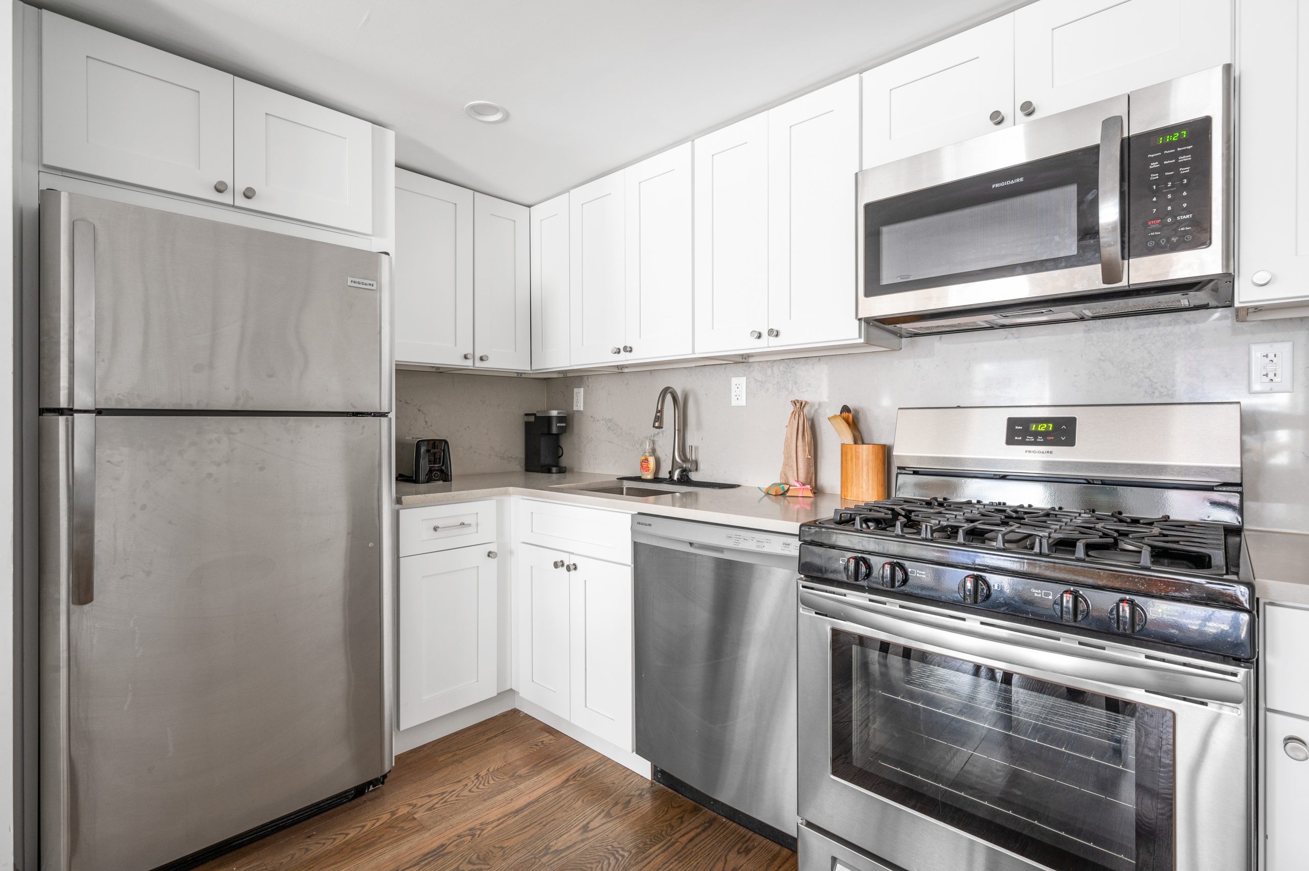 Including a dishwasher, microwave, oven, ridge, Keurig coffee maker, toaster, and kettle, the kitchen is set up with everything you need for your morning coffee, dinner at home, and all the moments in between.